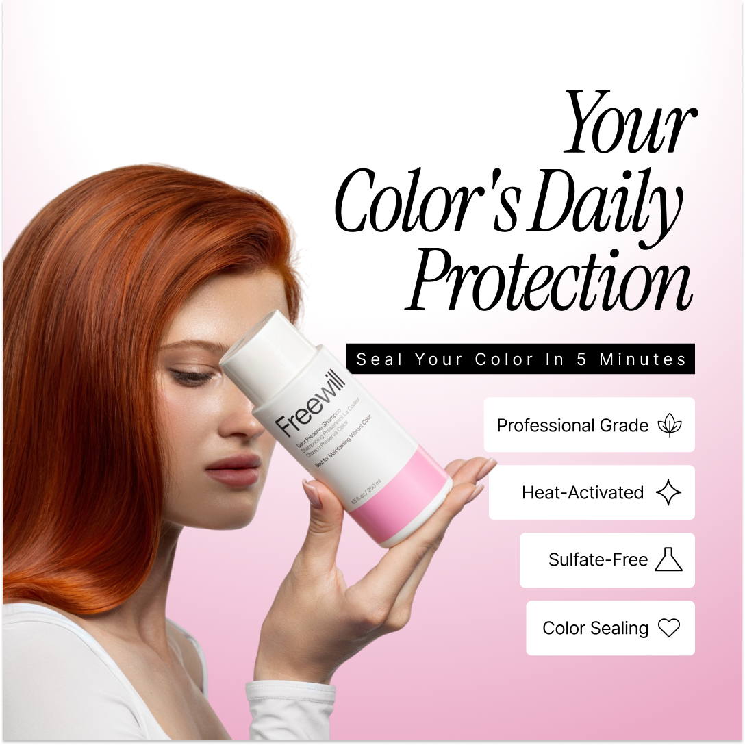 "Freewill's Color Preserve routine is formulated to protect and enhance color, ensuring your hair stays vibrant, fade-resistant, and glossy for extended color brilliance and hair health."